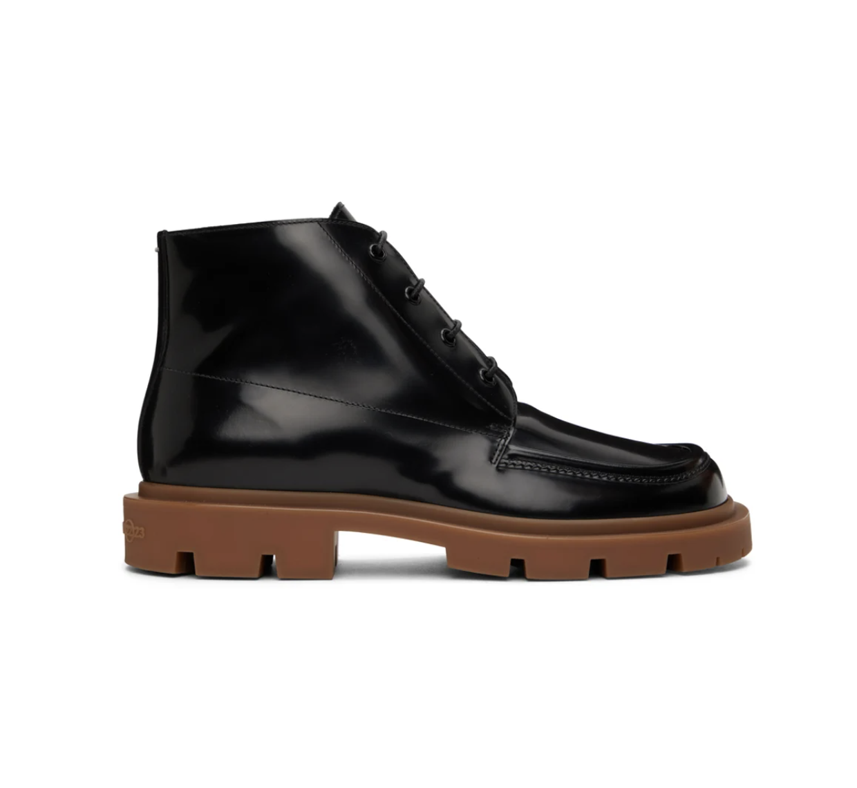 Alexander McQueen則以黑色皮革Lug Boots搭配西裝,融合英倫punk形象。這種鞋款混合正裝皮鞋和攀山鞋特色,呼應時尚而靈活的男士形象。