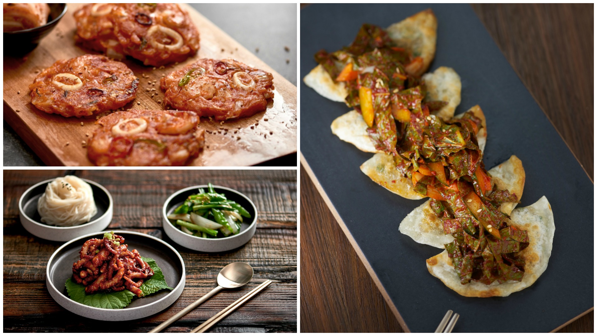 首首‧韓式小館以自家製韓式素餃子配韓風紅辣椒醬醋沙律、辣炒八爪魚配素冷麵及水芹菜、泡菜海鮮煎餅、傳統韓國五味子奶凍襯托不同的韓式酒釀,充滿韓式地道風味。
