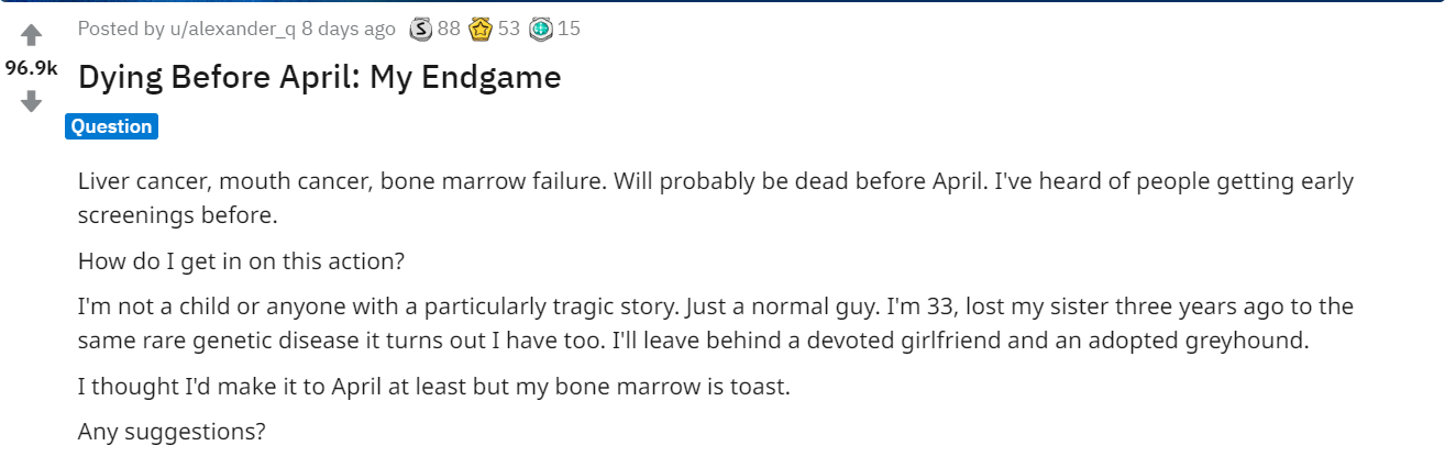 這個在Reddit上叫以alexander_q的網民早前就發文指自己與全世界的影迷一樣期待著End Game的上映,只是家族遺傳的「范可尼氏貧血」(Fanconi Anemia)令他身患多種癌症之餘,骨髓亦開始衰竭。33歲的他很有機會於短期內步他姐姐後塵就因病而撒手人寰。
