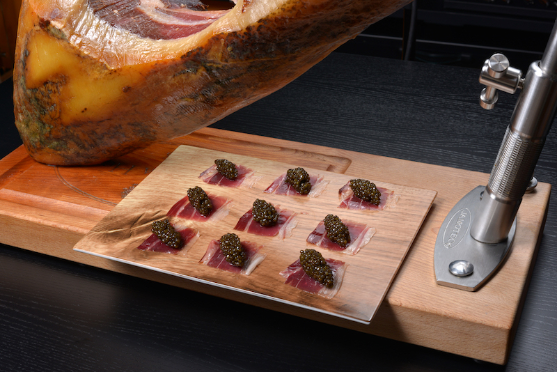 另一款受歡迎的火腿及魚子醬套裝「Iberico Ham & Royal Cristal Caviar」包括淨重 100 克的雙重橡果餵飼伊比利亞火腿片和淨重 30 克的黃金混合品種魚子醬(Royal Cristal Caviar )。混合品種的鱘魚在水中培養 8-10 年,肉質堅實,色澤呈淺灰和深啡色。套裝原價 HK$1,200,現特價只售 HK$980。