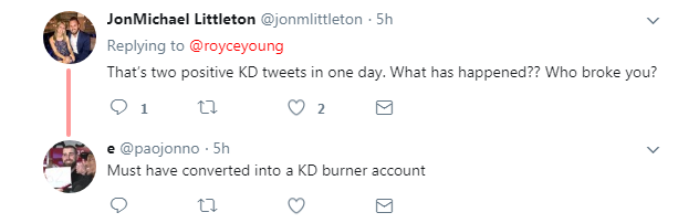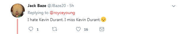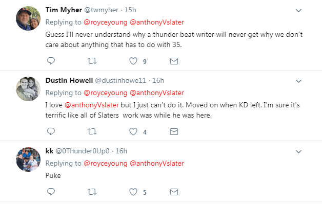 拍拖首則守則:切勿在現任前稱讚前度。上述規則在基本上在其他場合一樣適用,包括體育賽場。在球迷面前提起曾效力而不歡而散的球星簡直是罪大惡極。不幸的是,專門負責報導奧克拉荷馬雷霆隊的記者Royce Young就犯了以上錯誤。他在個人的Twitter戶口上先後提及在2016負於勇士後立即轉投該隊的Kevin Durant成為聯盟第二年輕攻入20,000分的球員,即時惹來雷霆球迷的怒火,令場面變得尷尬。