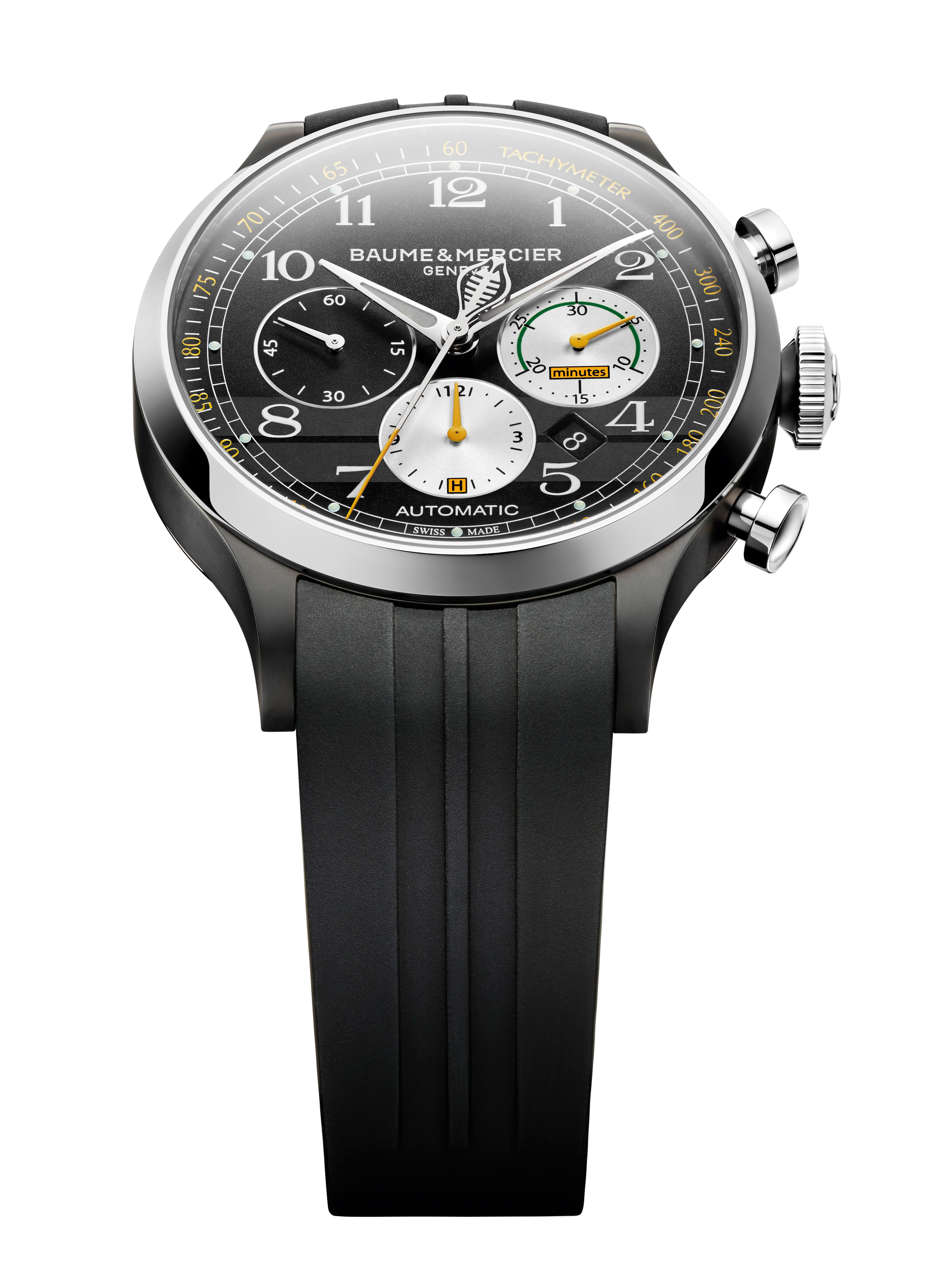 錶盤上不對稱的計時副盤佈局,令人想起 Cobra 賽車的標誌性儀錶盤。黑色錶盤、同色系水平賽車線和軚盤造型指針等,更突顯腕錶的賽車特色。計時秒針飾有 Cobra 賽車標誌,用於量度比賽速度的測速儀環繞錶圈 ,凸顯腕錶的賽車設計特色。