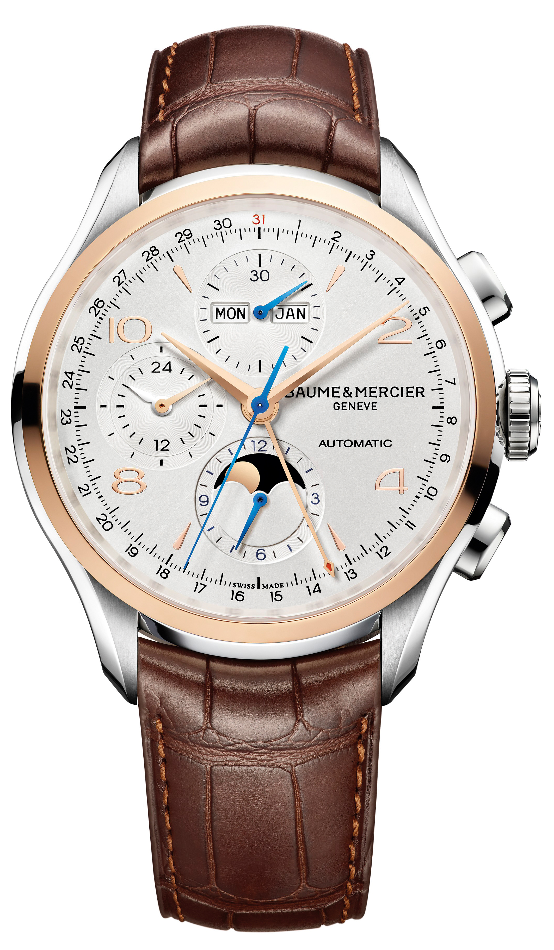 2012 年,品牌以名士博物館典藏的「黃金 50 年代」經典腕錶為靈感,推出了 Clifton 系列,今年此系列又再增添一枚全曆加計時自動腕錶,是很出色的一枚 everyday watch。腕錶錶盤佈局簡潔,中央放置了四枚指針,分別為時分顯示、計時秒針及日期顯示,12 時位置設有星期及月份顯示,9 時位置則是晝夜顯示,月相顯示設於 6 時位置。錶盤上於 12 時和 6 時位置還分別配備 30 分鐘累計器及和 12 小時累計器,全採用藍鋼指針悉心打造。腕錶直徑 43 毫米,不銹鋼配紅金 two tone,是近年最受歡迎的材質配搭。