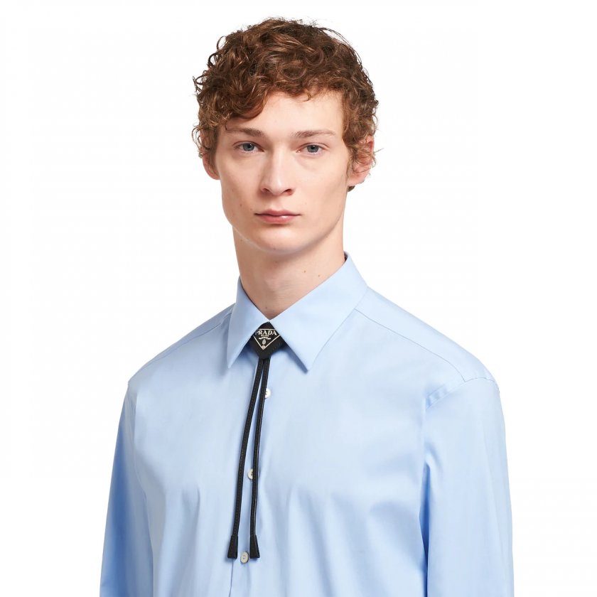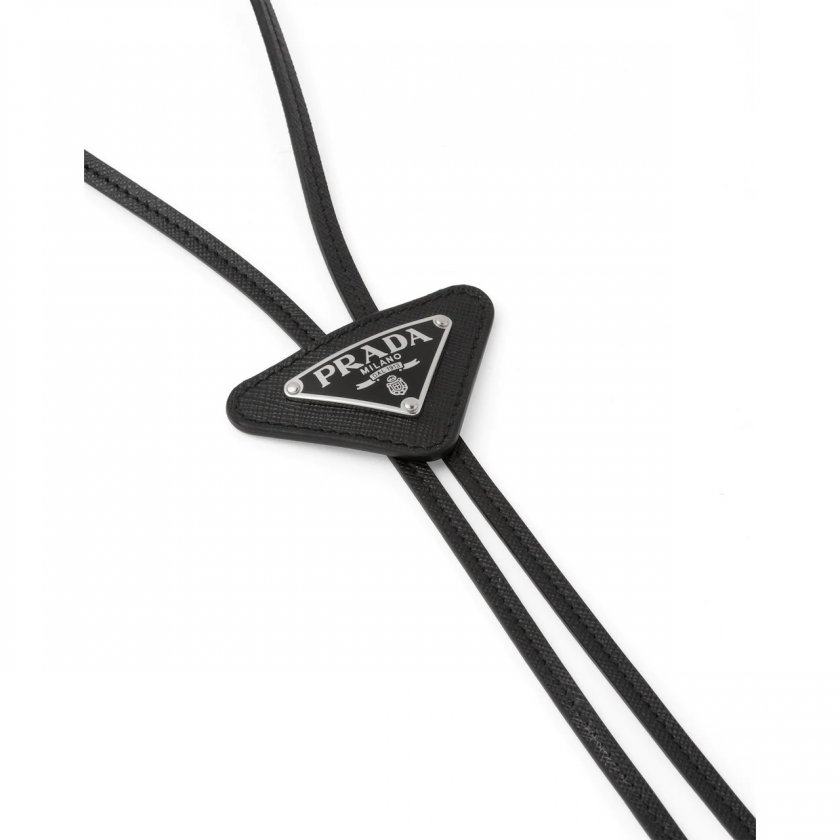Saffiano logo Bolo tie與大家傳統知道的Bolo tie一點都不像,Prada這款以全皮革製成,加上Prada的經典三角logo,讓造型添加不同的層次。比起傳統的Bolo Tie,它少了一份過於隆重之感,亦增加了一份年輕、玩味,因此配搭Saffiano logo Bolo tie出席不同的場合都非常適合,難怪它亦是不少男明星必入手的單品。