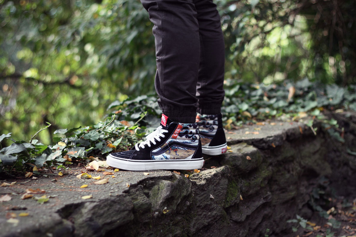 由於浮世繪的圖案與及用色非常注目,所以如果在比較和暖的天氣之下,穿上浮世繪T-shirt再配搭素色的褲子及鞋子已經可以出門。但如果秋冬的天氣下,以浮世繪T-shirt打底,在室內時將外套脫下,依然是全場焦點。