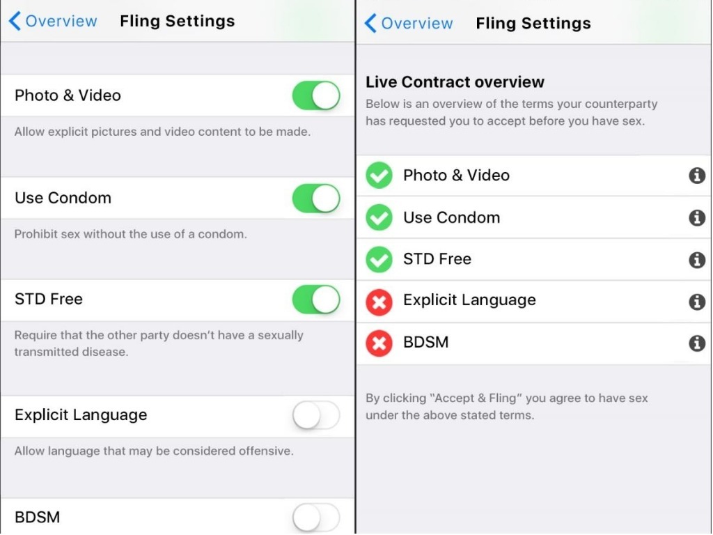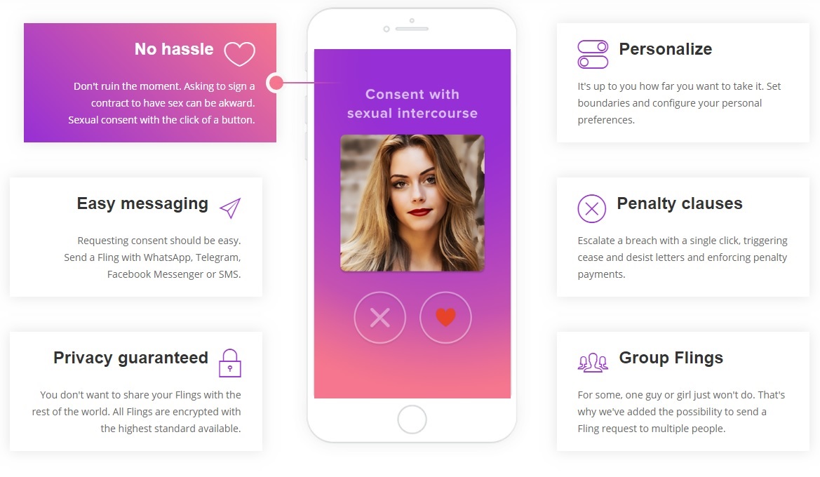 一個名為「LegalFling」的APP專為速食男女而設,由於去年的 #MeToo 浪潮爆出之後,除了荷李活的女星之外,亦引起了世界女士自己過往被性侵的迴響,為了保障男女相方,LegalFling開發出的目的是為了讓大家能夠更安全的享受性愛,認為人們在性愛前應該表示自己是在同意的情況下進行,因此簡單地簽定「合約」是必須的,而且APP內的「合約」還是具有法律效力的。